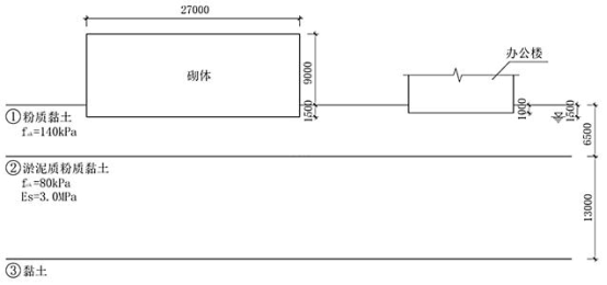 某厂区内既有三层砌体结构旁拟新建一多层办公楼,建设场地紧张,工期紧。办公楼双向对称,体型规则,无偏心,筏板基础,基础埋深1.0m。既有三层砌体房屋平面尺寸为27×21m(无结构缝),高度为9m,条形基础(基础埋深1.5m)。