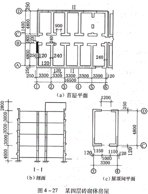 不定项选择题 某四层砖砌体房屋的首层平面、剖面及屋顶间平面如图4-27。其中的屋顶间位于③、④轴间。抗震设防烈度8度,采