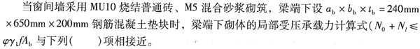 不定项选择题 某窗间墙尺寸为1200mm×370mm,如图4-2所示,采用MU10砖和M2.5的混合砂浆砌筑。已知大梁截面尺寸为b×h=200mm×550mm,跨度5m,支承长度a=240mm,梁端荷载设计值产生的支承压力付Nl=240kN,梁底墙体截面处的上部设计荷载为N0=50kN。
