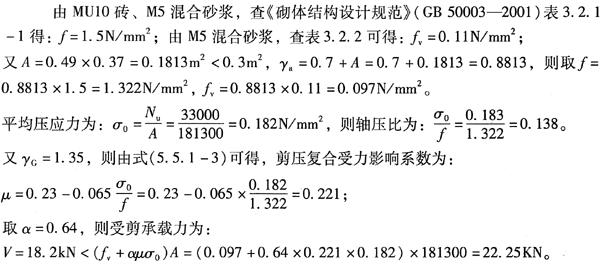 混凝土小型空心砌块砌体墙长1.6m,厚度为190mm,其上的永久荷载作用的正压力N=135kN,水平推力Y=25kN,永久荷载起控制作用,砌块墙采用MU10砌块