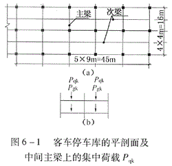 一客车停车库的楼面结构平面如图(a)所示,该结构采用单向板及主次梁结构,次梁的间距为4m,主梁(框架梁)的间距沿纵向为9m,沿横向为8m。次梁将楼面永久荷载及楼面活荷载以集中荷载传递给主梁(图(b)),当按《建筑结构荷载规范》(GB 50009-2001)(2006年版)规定考虑楼面活荷载折减系数时,则可算得次梁传给主梁的活荷载集中荷载标准值Pqk=( )kN。