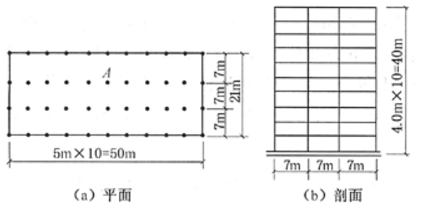 不定项选择题 位于9度抗震设防区、设计基本地震加速度值为0.40g,设计地震分组为第一组,建筑场地属Ⅱ类的办公大楼,地上10层,高40m的钢筋混凝土框架结构。剖面和平面见图所示。该楼层顶为上人屋面。通过计算,已知每层楼面的永久荷载标准值共12500kN,每层楼面的活荷载标准值共2100kN;屋面的永久荷载标准值共13050kN,屋面的活荷载标准值共2100kN。经动力分析,考虑了填充墙的刚度后的结构基本自振周期T1为0.9s。该楼的结构布置、侧向刚度及质量等均对称、规则、均匀、属规则结构。