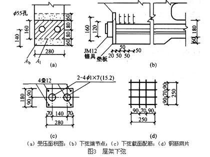 24m后张法预应力混凝土屋架下弦杆端节点如图3所示,采用C60混凝土,预应力钢筋用2束4φ1×7钢绞线,张拉控制应力σc