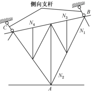 图所示桁架中AB和BC两杆采用Q235钢,其几何尺寸和受力为:BC杆之间几何长度为4×1507mm,AB杆之间几何长度为2×2039mm;N2=-27.9kN(压力),N1=-24.9kN(压力),N3=-879.8kN(压力),N4=-859.3kN(压力)。