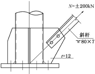 如图节点形式,斜向构件与钢管柱通过节点板连接。斜向构件为由两个等边角钢∟80×7组成的T形截面,钢材为Q235-B·F,