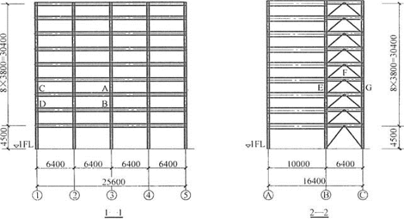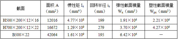 某9层钢结构办公建筑,房屋高度H=34.9m,抗震设防烈度为8度,布置如图所示,所有连接均采用刚接。支撑框架为强支撑框架,各层均满足刚性平面假定。框架梁柱采用Q345。框架梁采用焊接截面,除跨度为10m的框架梁截面采用H700×200×12×22外,其他框架梁截面均采用H500×200×12×16,柱采用焊接箱形截面B500×22。梁柱截面特性如表: