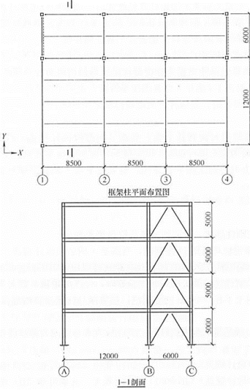 某4层钢结构商业建筑,层高5m,房屋高度20m,抗震设防烈度8度,X方向采用框架结构,Y方向采用框架-中心支撑结构,楼面采用50mm厚C30混凝土楼板,钢梁顶采用抗剪栓钉与楼板连接,如图所示。框架梁柱采用Q345,各框架柱截面均相同,内力计算采用一阶弹性分析。
