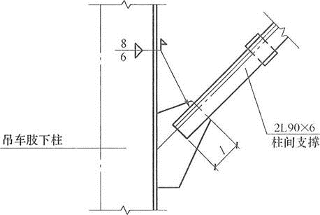 假定,厂房位于8度区,支撑采用Q235钢材,吊车肢下柱柱间支撑采用2L90×6,截面面积A=2128mm^2。试问,根据《建筑抗震设计规范》(GB 50011—2010)(2016年版)的规定,图柱间支撑与节点板最小连接焊缝长度l(mm),与下列何项数值最为接近?
