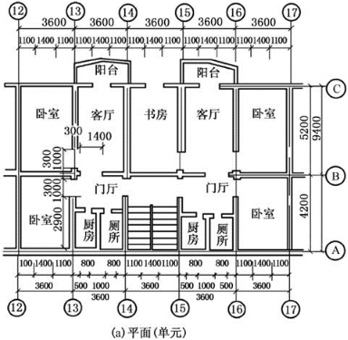 某六层混凝土砌块结构住宅,屋面及楼板均采用现浇混凝土,横墙、纵墙承重,标准层层高为2.8m,所有承重墙均为190mm厚砌块。全部墙体采用MU10砌块、MU10砂浆,芯柱Cb20混凝土,设防烈度7度。图所示为单元的平、剖面图。