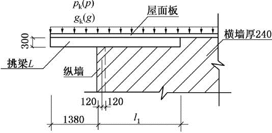 某建筑屋面挑梁b×h=240×300(mm),如图所示。屋面板传至挑梁的荷载标准值:活载qk=6.6kN/m;恒载和梁自重gk=16.8kN/m。则根据砌体规范对挑梁的抗倾覆要求,挑梁埋入砌体长度l1应满足( )。