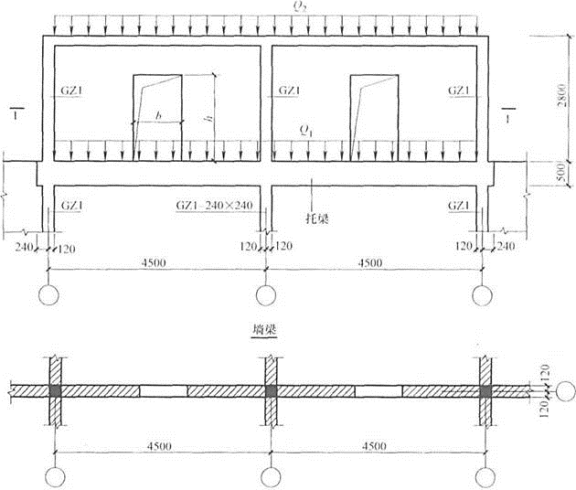 非抗震设计时,某顶层两跨连续墙梁,支承在下层的砌体墙上,如图所示。墙体厚度为240mm,墙梁洞口居墙梁跨中布置,洞口尺寸为b×h(mm×mm)。托梁截面尺寸为240mm×500mm。使用阶段墙梁上的荷载分别为托梁顶面的荷载设计值Q1和墙梁顶面的荷载设计值Q2。GZ1为墙体中设置的钢筋混凝土构造柱,墙梁的构造措施满足规范要求。