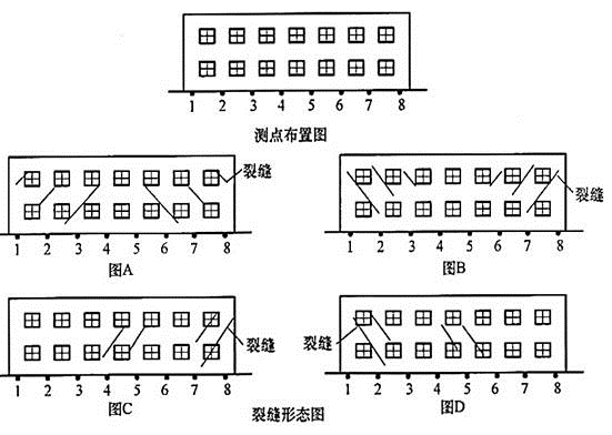 砌体结构纵墙等距离布置了8个沉降观测点,测点布置、砌体纵墙可能出现裂缝的形态等如图所示。