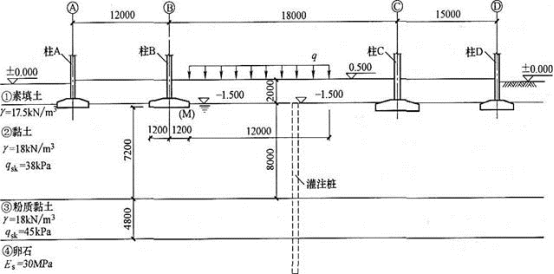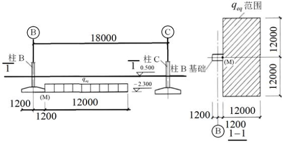 假定,根据生产要求,在B—C跨有大面积的堆载,如图所示。对堆载进行换算,作用在基础底面标高的等效荷载qeq=45kPa,堆载宽度12m,纵向长度为24mm。②层黏土相应于土的自重压力至土的自重压力与附加压力之和的压力段的Es=4.8MPa,③层粉质黏土相应于土的自重压力至土的自重压力与附加压力之和的压力段的Es=7.5MPa。试问,当沉降计算经验系数ψs=1,对②层及③层土,大面积堆载对柱B基础底面内侧中心M的附加沉降值sM(mm),与下列何项数值最为接近?( )