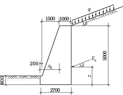 某毛石砌体挡土墙,其剖面尺寸如图所示。已知其墙背直立,排水良好,墙后填土与墙齐高,其表面倾角为β,填土表面的均布荷载为q