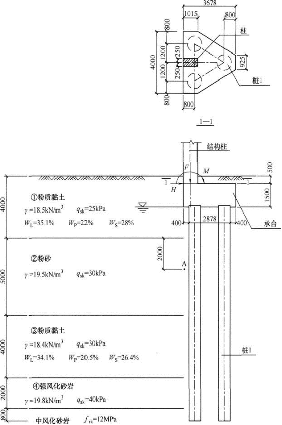 某扩建工程的边柱紧邻既有地下结构,抗震设防烈度为8度,设计基本地震加速度值为0.3g,设计地震分组第一组,基础采用直径800mm泥浆护壁旋挖成孔灌注桩,图为某边柱等边三桩承台基础图,柱截面尺寸为500mm×1000mm,基础及其以上土体的加权平均重度为20kN/m^3。