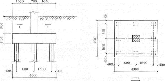 某框架结构柱基础,作用标准组合下,由上部结构传至该柱基竖向力F=6000kN,由风载控制的力矩Mx=My=1000kN·m。柱基础独立承台下采用400mm×400mm钢筋混凝土预制桩,桩的平面布置及承台尺寸如图所示。承台底面埋深3.0m,柱截面尺寸为700mm×700mm,居承台中心位置。承台采用C40混凝土,as=65mm。承台及承台以上土的加权平均重度取20kN/m^3。
