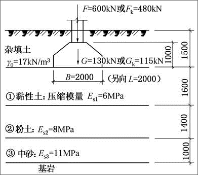 某方形独立柱基,底面尺寸为B=L=2.0m,埋置深度为1.5m。上部结构传至基础顶面处的竖向力设计值F=600kN,相应的竖向力标准值Fk=480kN(恒载占60%,活载占40%,准永久值系数ψq=0.5)。已知基础自重和基础上的土重设计值G=130kN,相应的基础自重和基础上的土重标准值Gk=115kN。基础及工程地质剖面如图所示。