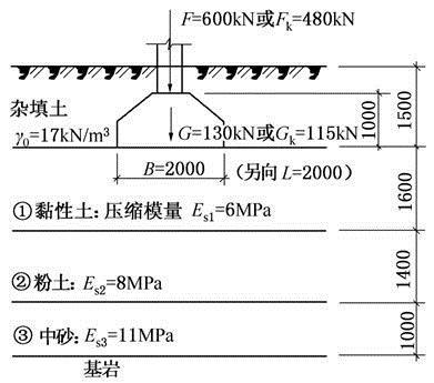 某方形独立柱基,底面尺寸为B=L=2.0m,埋置深度为1.5m。上部结构传至基础顶面处的竖向力设计值F=600kN,相应