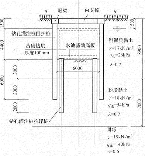 某地下水池采用钢筋混凝土结构,平面尺寸6m×12m,基坑支护采用直径600mm钻孔灌注桩结合一道钢筋混凝土内支撑联合挡土,地下结构平面、剖面及土层分布如图所示,土的饱和重度按天然重度采用。
