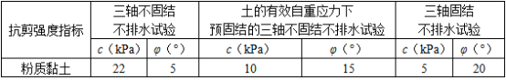 假定,坑外地下水位稳定在地面以下1.5m,粉质黏土处于正常固结状态,勘察报告提供的粉质黏土抗剪强度指标见表,地面超载q为20kPa。试问,基坑施工以较快的速度开挖至水池底部标高后,作用于围护桩底端的主动土压力强度(kPa),与下列何项数值最为接近?( )