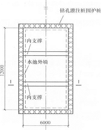 某地下水池采用钢筋混凝土结构,平面尺寸6m×12m,基坑支护采用直径600mm钻孔灌注桩结合一道钢筋混凝土内支撑联合挡土