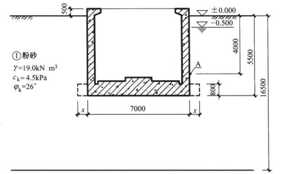 某安全等级为二级的长条形坑式设备基础,高出地面500mm,设备荷载对基础没有偏心,基础的外轮廓及地基土层剖面、地基土参数如图所示,地下水位在自然地面下0.5m。