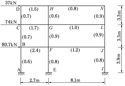 某一3层现浇框架中间一榀框架的几何尺寸及受力如图所示。图中括号内的数值为梁、柱杆件的相对线刚度值(已考虑了楼板的有利影响
