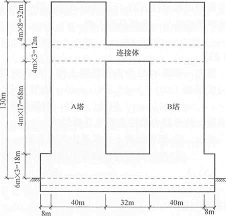 某现浇钢筋混凝土双塔连体结构,塔楼为办公楼,A塔和B塔地上31层,房屋高度130m,21~23层连体,连体与主体结构采用