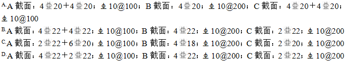)。关于梁L1两端截面A、C梁顶配筋及跨中截面B梁底配筋(通长,伸入两端梁、柱内,且满足锚固要求),有以下4组配置。试问,哪一组配置与规范、规程的最低构造要求最为接近?( )
