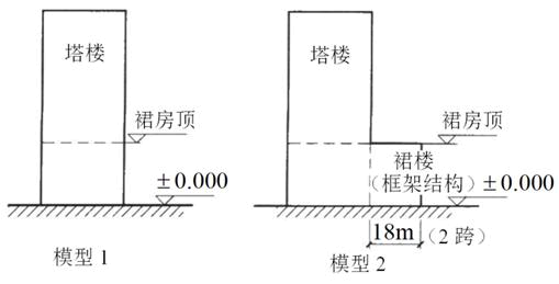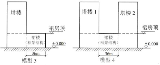 假定,裙楼右侧沿塔楼边设防震缝与塔楼分开(1~5层),左侧与塔楼整体连接。防震缝两侧结构在进行控制扭转位移比计算分析时,有4种计算模型,如图所示。如果不考虑地下室对上部结构的影响,试问,采用下列哪一组计算模型,最符合《高层建筑混凝土结构技术规程》(JGJ 3—2010)的要求?( )