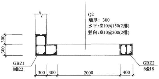 假定,核心筒剪力墙Q2第30层墙体及两侧边缘构件配筋如图所示,剪力墙考虑地震作用组合的轴压力设计值N为3800kN。试问,剪力墙水平施工缝处抗滑移承载力设计值V(kN),与下列何项数值最为接近?( )