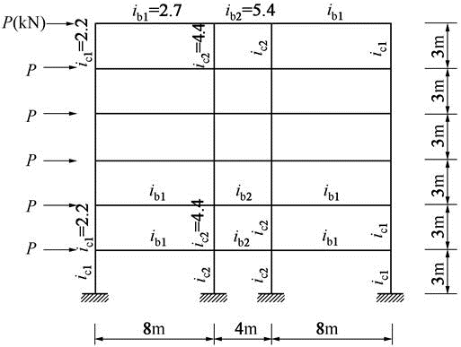 某6层钢筋混凝土框架结构,其计算简图如图所示。边跨梁、中间跨梁、边柱及中柱各自的线刚度,依次分别为ib1、ib2、ic1和ic2(单位为10^10N·mm),且在各层之间不变。