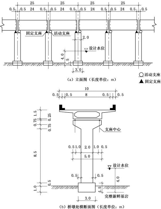 某多跨简支梁桥,其总体布置如图所示。每孔跨径25m,计算跨径为24m,桥梁总宽10m,行车道宽度为8.0m,通行二列汽车。该桥上部结构采用预应力混凝土箱梁,桥墩支承在岩基上,由混凝土独柱墩身和带悬臂的盖梁组成。桥墩上设立四个支座,支座的横桥向中心距为4.0m。计算荷载为公路—Ⅱ级,汽车荷载冲击系数为μ=0.285。混凝土的容重按25kN/m^3计算。