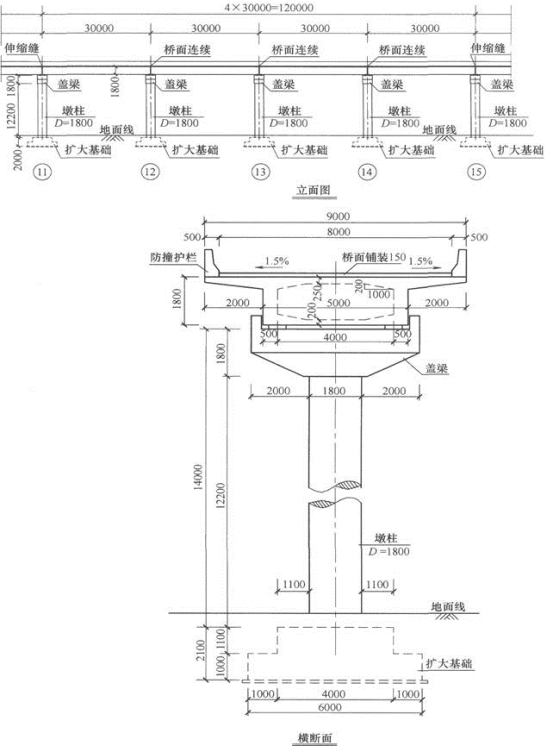 某城市快速路上的一座立交匝道桥,其中一段为四孔各30m的简支梁桥,其总体布置如图所示。单向双车道,桥梁总宽9.0m,其中行车道净宽度为8.0m。上部结构采用预应力混凝土箱梁(桥面连续),桥墩由扩大基础上的钢筋混凝土圆柱墩身及带悬臂的盖梁组成。梁体混凝土线膨胀系数取α=0.00001。设计荷载:城-A级。
