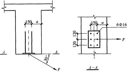 钢筋混凝土梁底有锚板和对称配置的直锚筋所组成的受力预埋件,如图所示。构件安全等级均为二级,混凝土强度等级为C35,直锚筋为6φ16(HRB400级),已采取防止锚板弯曲变形的措施。所承受的荷载F作用点位于锚板表面中心,力的作用方向如图所示。[2011年真题]