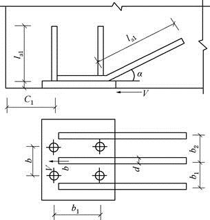 如图所示,由预埋板和对称于力作用线配置的弯折锚筋与直锚筋共同承受剪力的预埋件,已知承受的剪力V=225kN,直锚筋直径d=14mm,共4根,弯折钢筋与预埋钢板板面间的夹角α=30°,直锚筋间的距离b1和b均为100mm,弯折钢筋之间的距离b2=100mm,构件的混凝土为C30,钢板厚t=10mm,直锚筋与弯折锚筋均采用HRB335钢筋,钢板为Q235钢。
