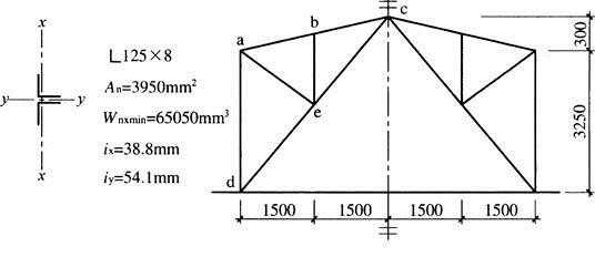 某厂房三铰拱式天窗架采用Q235B钢制作,其平面外稳定性由支撑系统保证。天窗架侧柱ad选用双角钢L125×8,天窗架计算