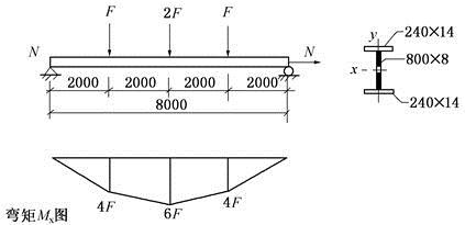 某轴心受拉构件的受力情况和截面尺寸如图所示,承受的静力荷载设计值为N=1000kN,钢材为Q235A,构件截面无削弱,则截面所能承受的最大横向荷载设计值F(不考虑构件自重)为( )kN。