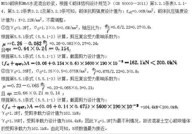 某房屋中横墙(见图),采用混凝土小型空心砌块MU10(孔洞率45%)、水泥混合砂浆Mb5砌筑,施工质量控制等级为B级;截面尺寸为5600mm×190mm;由恒荷载标准值产生于墙体水平截面上的平均压应力为0.5MPa,作用于墙体的水平剪力设计值为200.0kN。