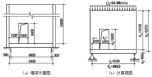 已知柱间基础梁上墙体高15m,双面抹灰,墙厚240mm,采用MU10烧结普通砖、M5混合砂浆砌筑,墙上门洞尺寸如图所示,柱距6m,基础梁长5.45m,伸入支座0.3m;混凝土为C30,纵筋为HRB335级,箍筋为HPB300级。