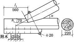 如图所示,某临时性屋架端节点的单齿连接,齿深范围内的弓形垂直面积为10400mm2。上下弦夹角26°34′,已知上弦杆O