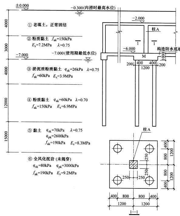 某单层独立地下车库,采用承台下桩基加构造防水底板的做法,柱A截面尺寸500mm×500mm,桩型采用长螺旋钻孔灌注桩,桩径d=400mm,桩身混凝土重度23kN/m3,强度等级为C30,承台厚度1000mm,有效高度h0=取950mm,承台和柱的混凝土强度等级分别为C30(ft=1.43N/mm2)和C45(ft=1.80N/mm2)。使用期间的最高水位和最低水位标高分别为-0.300m和-7.000m,柱A下基础剖面及地质情况见图。[2014年真题]
