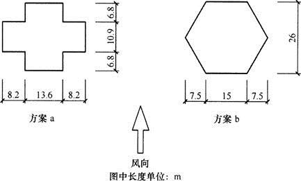 某12层办公楼,房屋高度为46m,采用现浇钢筋混凝土框架—剪力墙结构,质量和刚度沿高度分布均匀且对风荷载不敏感,地面粗糙度为B类,所在地区50年重现期的基本风压为0.65kN/m,拟采用两种平面方案,如图所示。假定,在如图所示的风作用方向下,两种结构方案在高度Z处的风振系数βz相同。[2013年真题]