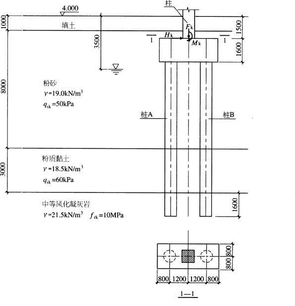 某框架结构办公楼边柱的截面尺寸为800mm×800mm,采用泥浆护钻孔壁灌注桩两桩承台独立基础。荷载效应标准组合时,作用于基础承台顶面的竖向力Fk=5800kN,水平力Hk=200kN,力矩Mk=350kN·m,基础及其以上土的加权平均重度取20kN/m3,承台及柱的混凝土强度等级均为C35。抗震设防烈度7度,设计基本地震加速度值0.10g,设计地震分组第一组。钻孔灌注桩直径800mm,承台厚度1600mm,h0取1500mm。基础剖面及土层条件见图5-16。[2011年真题]