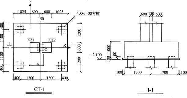 1.对应于某起控制作用的荷载效应标准组合,上部结构柱KZl和KZ2作用于基础顶部的轴力分别为2160kN和3840kN。试问,在图示参考坐标系下,两柱的竖向力合力作用点位置xc(mm)与下列何项数值最为接近?( )