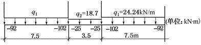 1.在重力荷载代表值作用下,已知三层横梁的支座弯矩如图所示。当考虑梁端塑性变形内力重分布而对梁端负弯矩进行调幅,并取调幅系数为0.8时,则边横梁的跨中弯矩设计值M最接近于( )kN·m。