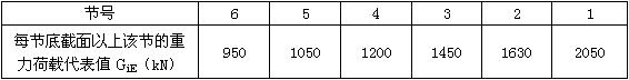 某钢筋混凝土圆形烟囱,如图所示,抗震设防烈度为8度,设计基本地震加速度为0.2g,设计地震分组为第一组,场地类别为Ⅱ类,基本自振周期T1=1.25s,50年一遇的基本风压ω0=0.45kN/m2,地面粗糙度为B类,安全等级为二级。已知该烟囱基础顶面以上各节(共分6节,每节竖向高度10m)重力荷载代表值如下表所示。[2014年真题]