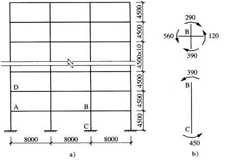 图所示的框架为某框架—剪力墙结构中的一榀边框架,其抗震等级为二级,底部一、二层顶梁截面高度为700mm,梁顶与板顶平,柱截面为700mm×700mm。已知在重力荷载和地震作用下,柱BC的轴压比为0.75,节点B和柱BC未按“强柱弱梁”调整的组合弯矩设计值(kN·m)如图所示。[2012年真题]
