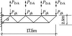 一商厦建筑的抗震设防烈度为8度(0.30g)。该建筑的入口处采用悬挑长度为17.5m的钢桁架(见图),桁架高度为2.5m。钢桁架节点上的重力荷载代表值Pgk=90kN。由此,可算得该桁架端部斜腹杆a仅由竖向地震作用产生的轴向力
