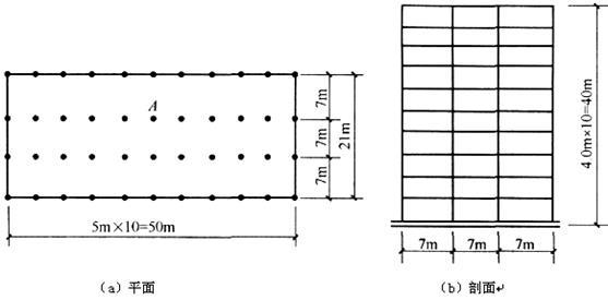 位于9度抗震设防区、设计基本地震加速度值为0.40g,设计地震分组为第一组,建筑场地属Ⅱ类的办公大楼,地面以上有10层,总高40m,结构形式为钢筋混凝土框架结构。剖面和平面如图所示。该楼层顶为上人屋面。通过计算,已知每层楼面的永久荷载标准值共12500kN,每层楼面的活荷载标准值共2100kN;屋面的永久荷载标准值共13050kN,屋面的活荷载标准值共2100kN。经动力分析,考虑了填充墙的刚度后的结构基本自振周期T1为0.9s。该楼的结构布置、侧向刚度及质量等均对称、规则、均匀、属规则结构。